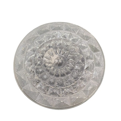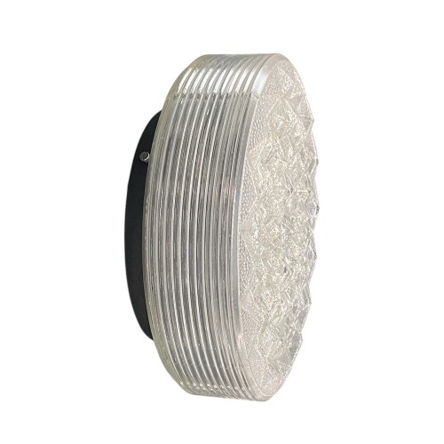 Plafoniera o applique tonda da esterno realizzata in ferro con diffusore in vetro decorato trasparente, caratterizzata da un design moderno e raffinato.