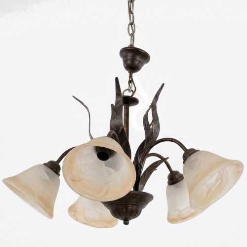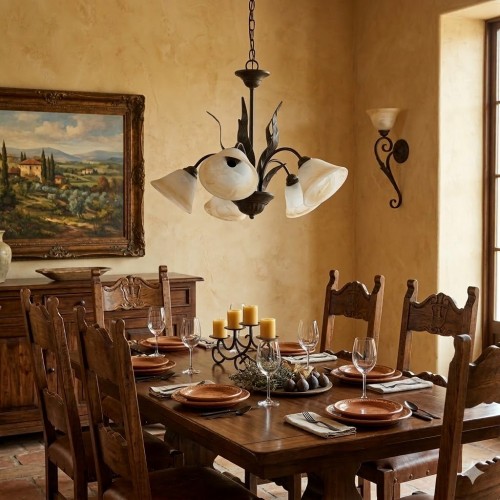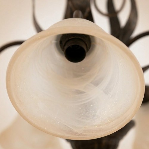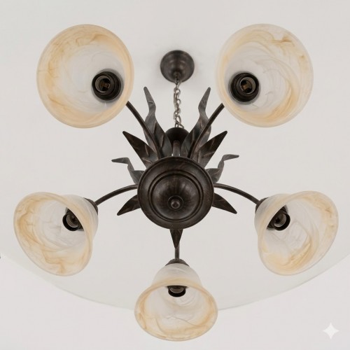 Il corpo centrale e i bracci sono realizzati in ferro battuto o metallo con una finitura brunita/anticata.
