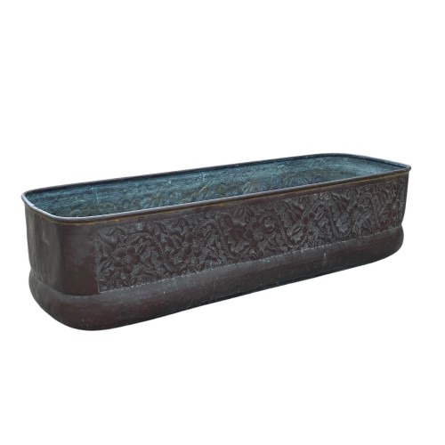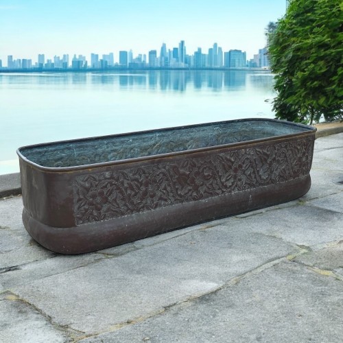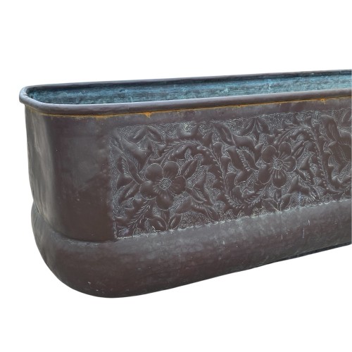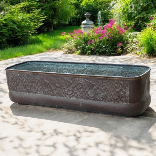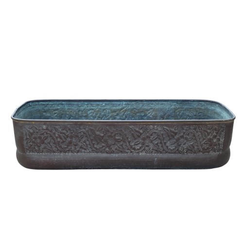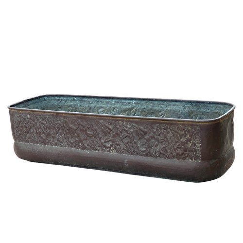 Fioriera rettangolare realizzata interamente in rame materiale pregiato e resistente agli agenti atmosferici, che nel tempo sviluppa una patina naturale, conferendole un fascino antico e vissuto.