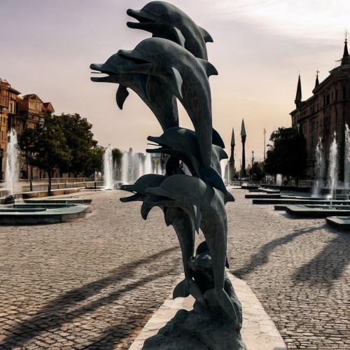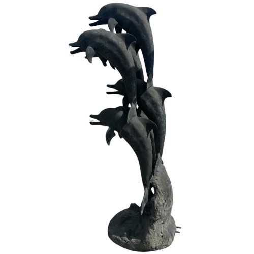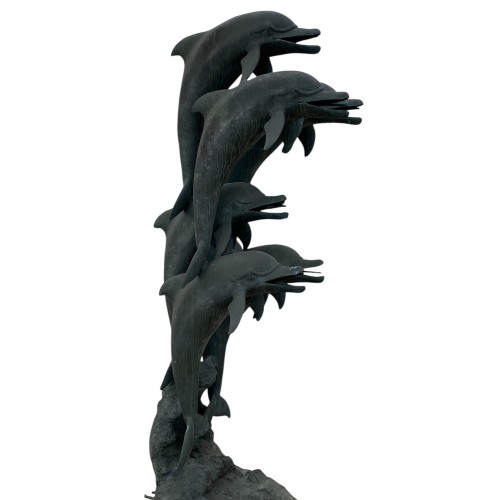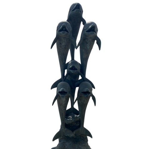 Fontana a zampillo in bronzo raffigurante un gruppo di sei delfini rappresentati in una composizione verticale ed elegante.