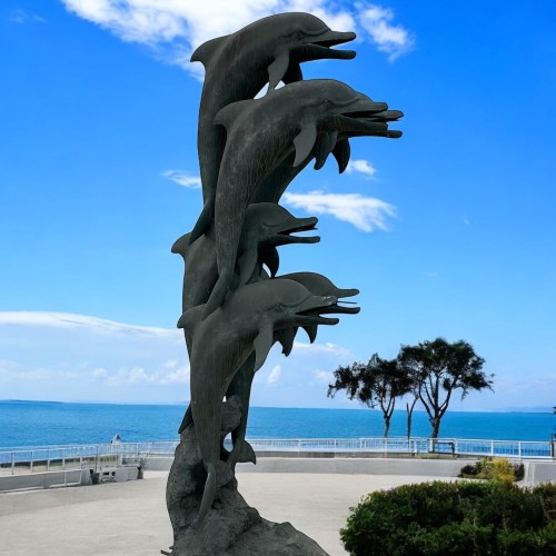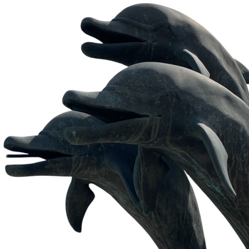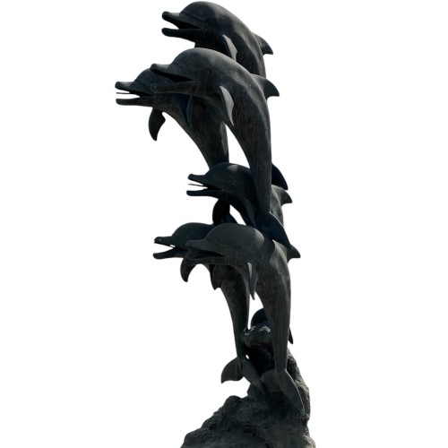 I sei delfini sono realizzati con grande realismo e maestria in fusione in bronzo a cera persa. Sono disposti in una posizione ascendente, come se stessero saltando fuori dall'acqua in una danza sincronizzata.