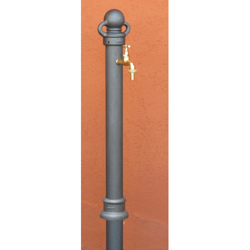 Fontana realizzata in fusione di ghisa e acciaio. La parte superiore della fontana è in ghisa ed è rimovibile in modo da consentire l'ispezione e il montaggio del rubinetto. La testa della fontana è realizzata in fusione di ghisa tratta con antiruggine e nello standard con vernice ad immersione micacea di colore antracite. La colonna della fontana è realizzata in acciaio zincato e verniciata con vernice micacea ad alta resistenza. La colonna della fontana presenta prevede di essere murata per una profondità di 15 cm. La testa della fontana prevede due occhielli che possono essere utilizzati per applicare una corda o catene e fungere da delimitatore d'area o dissuasore, oppure essere utilizzati per agganciare il materiale di servizio della fontana.