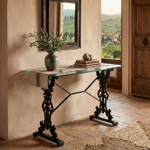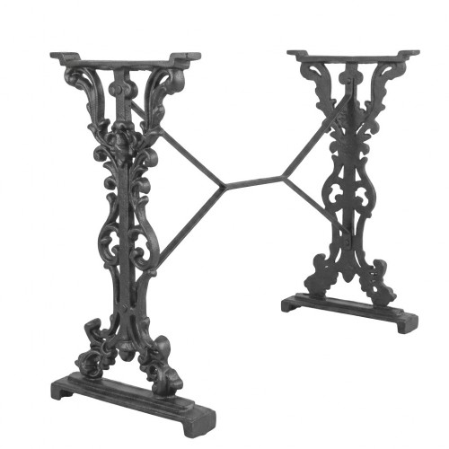 Le gambe presentano ricche decorazioni a volute, fregi e intagli traforati che evocano l'estetica dei giardini europei dell'Ottocento.