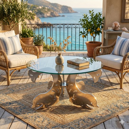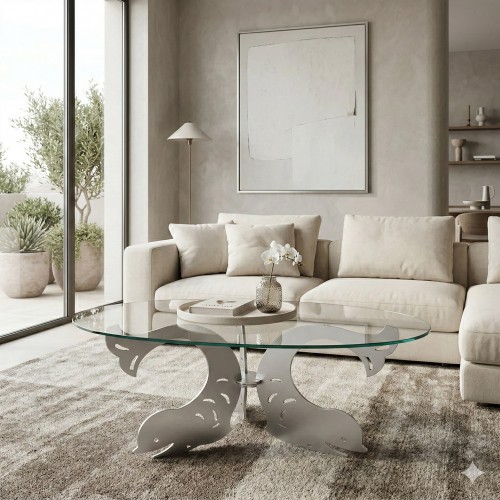 Basamento per tavolino da salotto realizzato in ferro dal design artistico e moderno, caratterizzato da un tema marino molto stilizzato con finitura grigio chiaro alluminio.