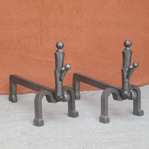 Coppia di robusti alari realizzati in ghisa grezza per focolari e camini.