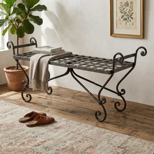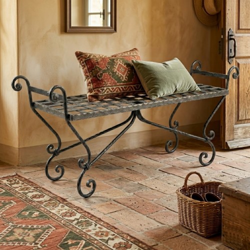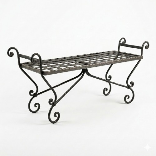 Panca in ferro battuto dal design classico e artigianale, caratterizzata da linee eleganti e una struttura robusta.