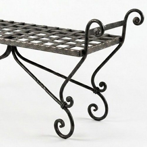 Il design è ricco di volute e riccioli forgiati a mano. Questi motivi a spirale decorano sia la parte terminale delle gambe sia i braccioli laterali, conferendo all'oggetto un aspetto sofisticato di ispirazione barocca o rustica.