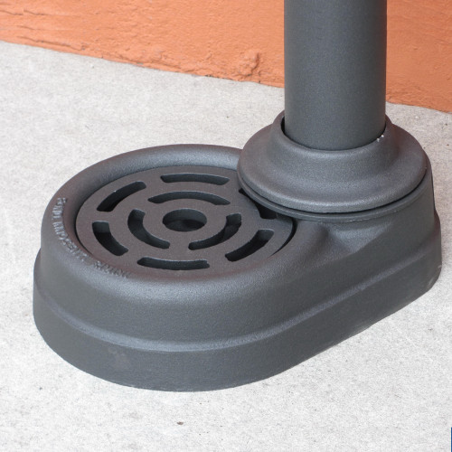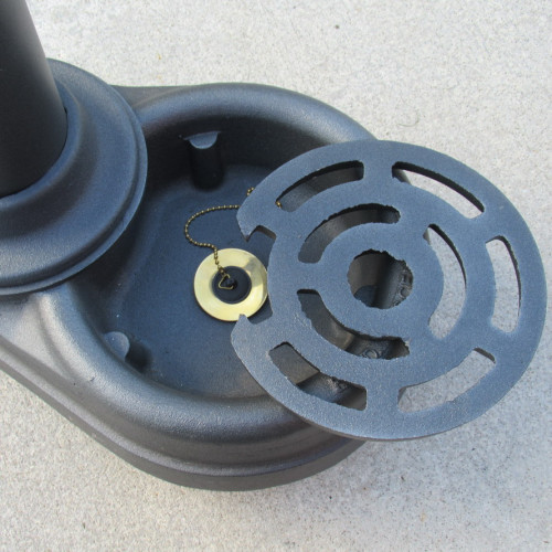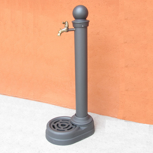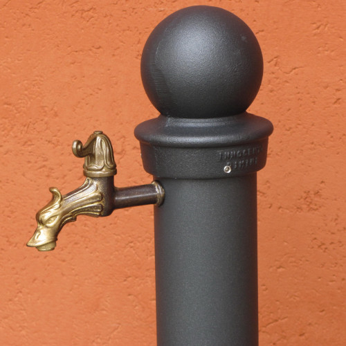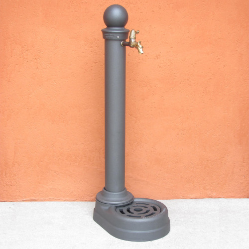 Fontanella realizzata con colonna in acciaio zincato, particolari decorativi in ghisa, vaschetta in alluminio con griglietta mobile per agevolare la pulizia.