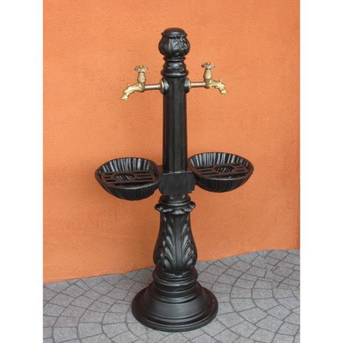Fontana per giardino, arredo urbano e parco realizzata in fusione di ghisa e alluminio. Realizzata con doppia vasca e doppio rubinetto per le esigenze di uso multiplo. La parte superiore della fontana è rimovibile in modo da consentire l'ispezione e il montaggio del rubinetto. La fontana è realizzata in fusione di ghisa e allumino tratta con antiruggine ad immersione e nello standard con vernice ad immersione micacea di colore antracite. Il foro nella fontana del rubinetto è di diametro mm 28 è prevede l'uso di un manicotto in ferro standard (non fornito) filettato internamente a 1/2" per il montaggio del rubinetto e l'accoppiamento con l'impianto; è previsto un blocco tramite una vite che serra il manicotto del rubinetto alla fontana. La colonna della fontana in alluminio è cava per tutta la lunghezza. Le vaschette in ghisa della fontana sono a sospensione ed sono ancorata alla colonna della fontana per mezzo di 4 viti; le vaschette della fontana presentano un foro di scarico filettato M3/4". Lo scarico delle vaschette della fontana avviene all'interno della colonna della fontana. Nelle vasche della fontana possono essere previste griglia in ghisa posate a gravità che permettono di avere un appoggio piano.