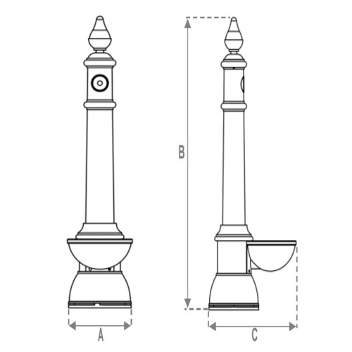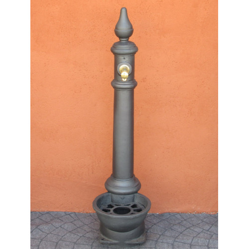 La fontana è realizzata in fusione di ghisa tratta con antiruggine ad immersione e nello standard con vernice ad immersione micacea di colore antracite. Il foro nella fontana del rubinetto è adatto per rubinetti da 1/2". La colonna della fontana in ghisa è cava per tutta la lunghezza. La vaschetta della fontana in ghisa è a sospensione ed è ancorata alla colonna della fontana per mezzo di 1 vite. Lo scarico della vaschetta della fontana avviene all'interno della colonna della fontana. Nella vasca della fontana in ghisa è prevista una griglia in ghisa che permette di avere un appoggio piano.