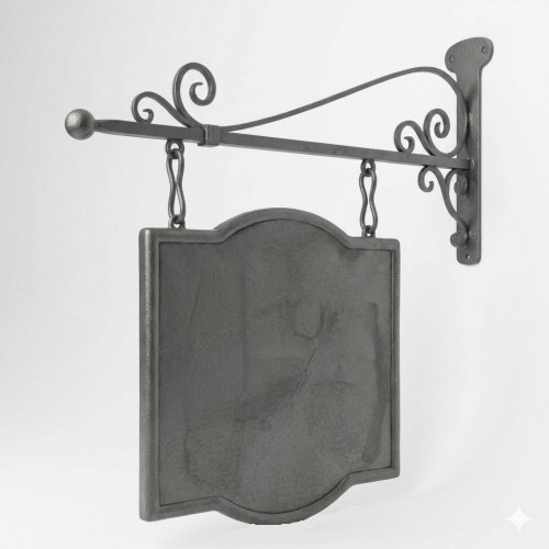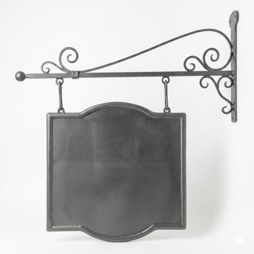 Elegante insegna a bandiera in ferro battuto, caratterizzata da uno stile classico e artigianale.