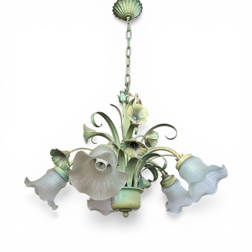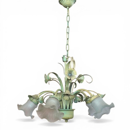 Il lampadario è appeso tramite una catena a maglie metalliche che termina con un rosone a soffitto a forma di conchiglia o petalo rovesciato.