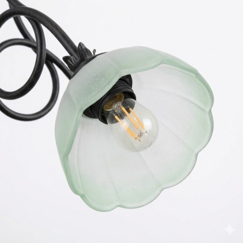 I cinque paralumi sono realizzati in vetro opaco/satinato, che permette una diffusione morbida della luce, evitando abbagliamenti. Il vetro presenta una delicata sfumatura verde pastello verso i bordi, che richiama elementi naturali e conferisce al lampadario il suo carattere distintivo.