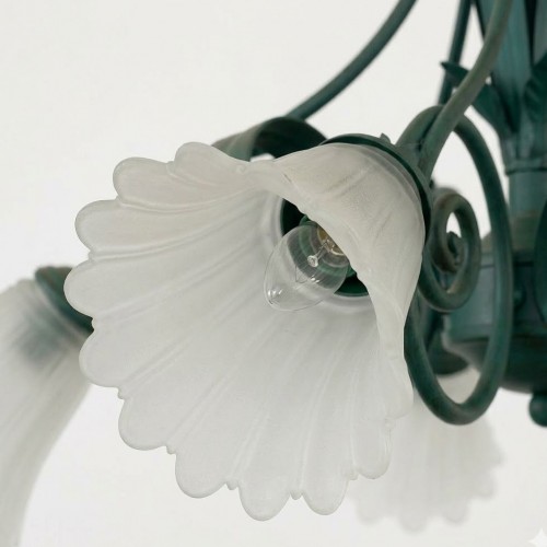 La struttura metallica è di un particolare verde scuro opaco che le conferisce un aspetto vintage, Il corpo centrale è decorato con elementi che ricordano foglie lunghe e affusolate che si estendono verso l'alto, insieme a riccioli decorativi in metallo.