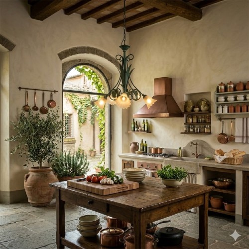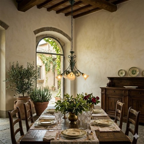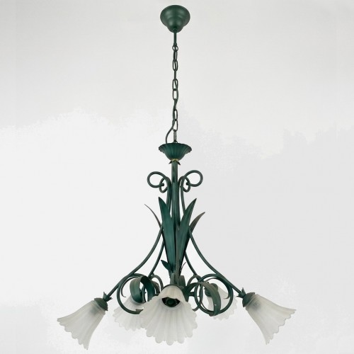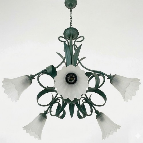 Lampadario a sospensione dal design floreale e classico, caratterizzato da un'estetica che richiama lo stile Art Nouveau o "Liberty".