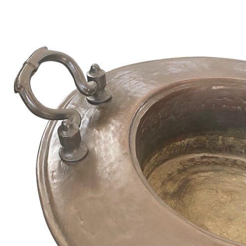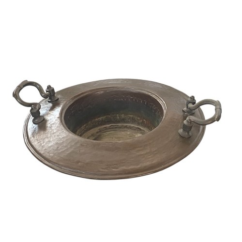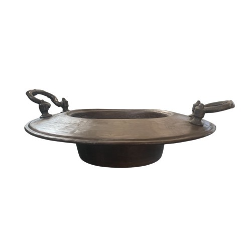 Ciotola o bacile antico, in rame caratterizzato da una una sezione centrale profonda e circolare circondata da una tesa estremamente larga e leggermente spiovente. Questa conformazione ricorda quasi la forma di un cappello a tesa larga rovesciato.