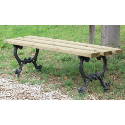 Le gambe della panchina sono realizzate in fusione di ghisa tratta con antiruggine ad immersione e nello standard con vernice ad immersione micacea di colore antracite. Il legno utilizzato è pino trattato in autoclave al naturale. La ferramenta è composta da mordenti in acciaio zincato.