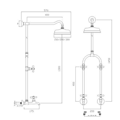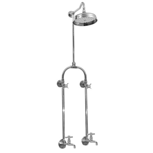 Gruppo doccia realizzato in ottone con valvole apri chiudi acqua calda e fredda e rubinetti fontana dallo stile lineare e moderno. In foto in finitura ottone effetto cromata, è possibile averla nelle finiture sotto indicate.