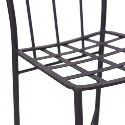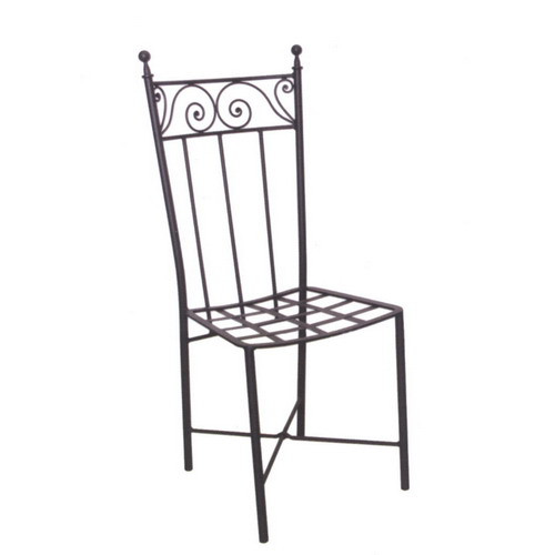 Sedia realizzata in ferro battuto e forgiato e zincata a caldo. Schienale anatomico realizzato in tondino di ferro con ricci nella parte superiore.